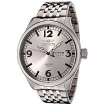 The Invicta Men's Collection Stainless Steel Watch offers genuine style in an easy-to-read classic design. The round silver-tone case and bezel are made of brushed and polished stainless steel and complement the bracelet. The silver dial features black Arabic numerals at three six nine and 12 o'clock and rectangular indices mark all remaining hours. The dial features a day and date window at the three o'clock hour a black outside minute track and a black seconds hand accompanies luminous black decorative hour and minute hands at the center of the dial. An alternating pattern of brushed and polished silver-tone stainless steel on the bracelet adds depth to the design and the bracelet securely fastens with a fold-over clasp and double push-button safety. This timepiece offers reliable Swiss quartz movement and is protected by a durable flame-fusion crystal.